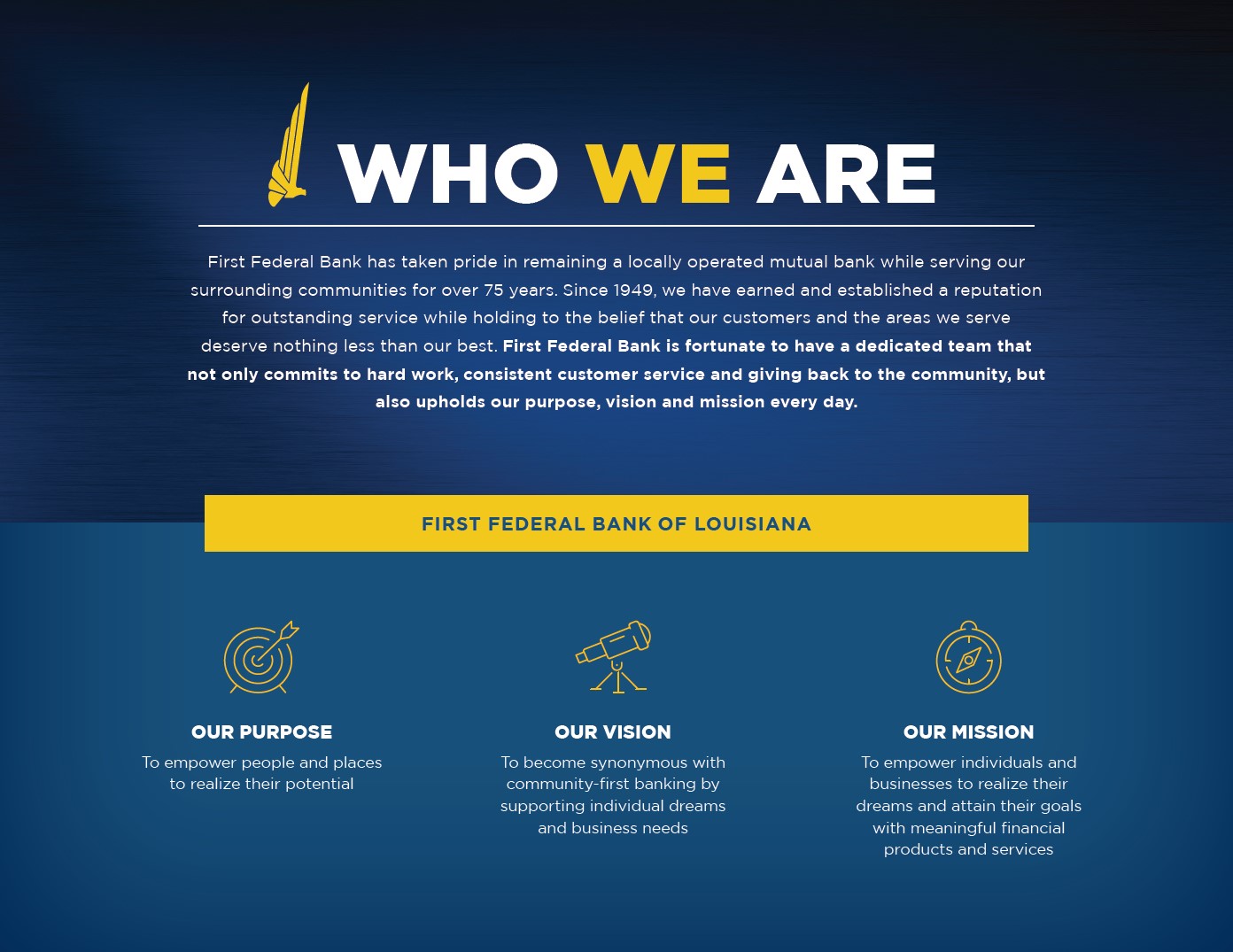 First Federal Bank of Louisiana is a full-service, locally owned community bank that has helped build the communities we serve for over 75 years. With over one billion dollars in assets and 16 offices serving multiple parishes across Southwest and Central Louisiana, we are proud to offer our customers comprehensive retail and commercial products as well as investment services to meet all of their financial needs. Empowering people and places to realize and attain their dreams is what our community-first banking is all about, and that's what our team strives to do in the communities we serve each and every day.